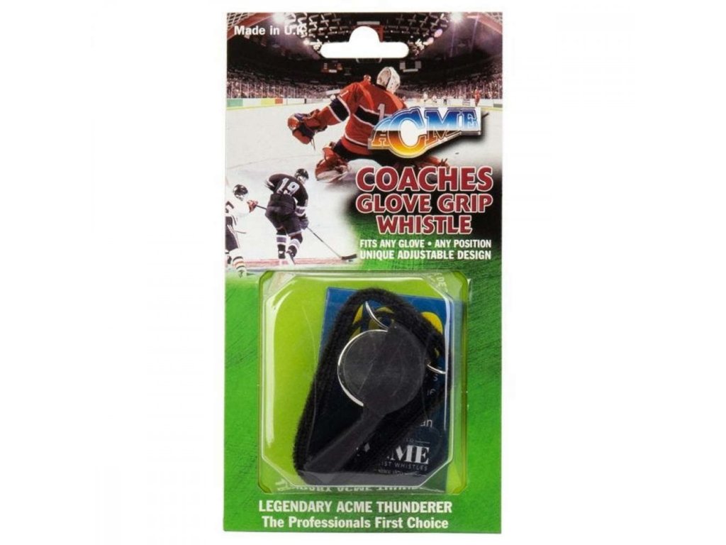 Professzionális ACME jégkorong edzői síp kesztyűre. Az angol ACME cég 1870 óta specializálódott a sípok gyártására, és a világ vezetőjének számít ebben az ágazatban.