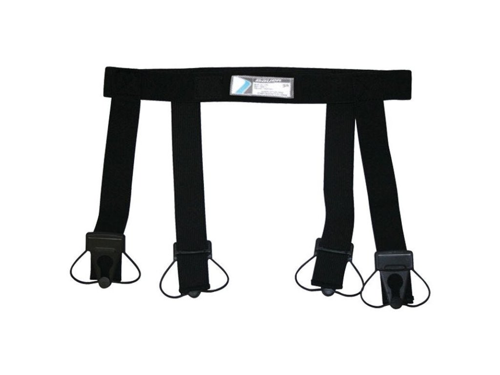 Bauer gyermek harisnyatartó minden egyes pántján csatok találhatók, amelyekkel a sportszárakhoz rögzítheted azokat. Ezek a kapcsok minden egyes harisnya elülső és hátsó oldalára külön-külön rögzíthetők, így biztosítva, hogy a harisnyák a helyükön maradjanak a játék során.
