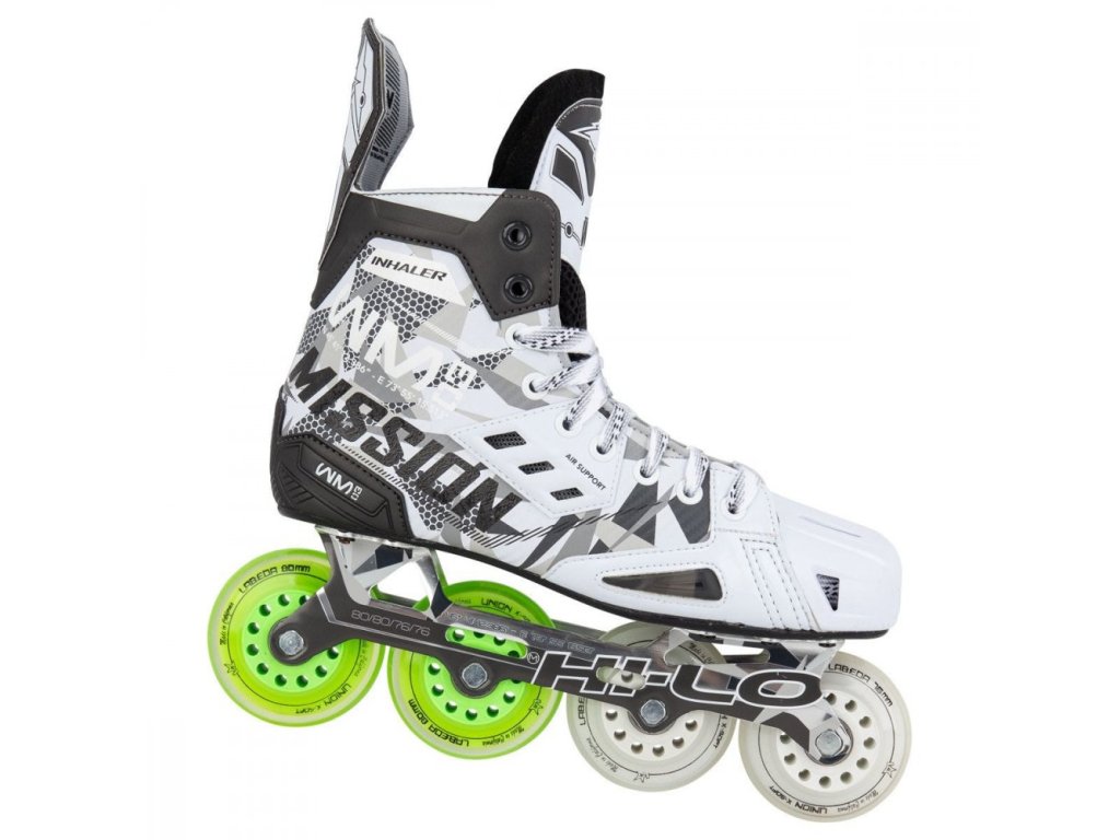 Mission Inhaler WM03 Senior görkorcsolya teljesítményorientált inline hoki korcsolyák, tartós, szellőző konstrukcióval, aszimmetrikus orral és minőségi alkatrészekkel, amelyek jó stabilitást, kontrollt és kényelmet biztosítanak sportos vezetés közben.